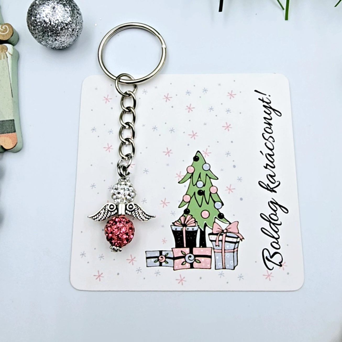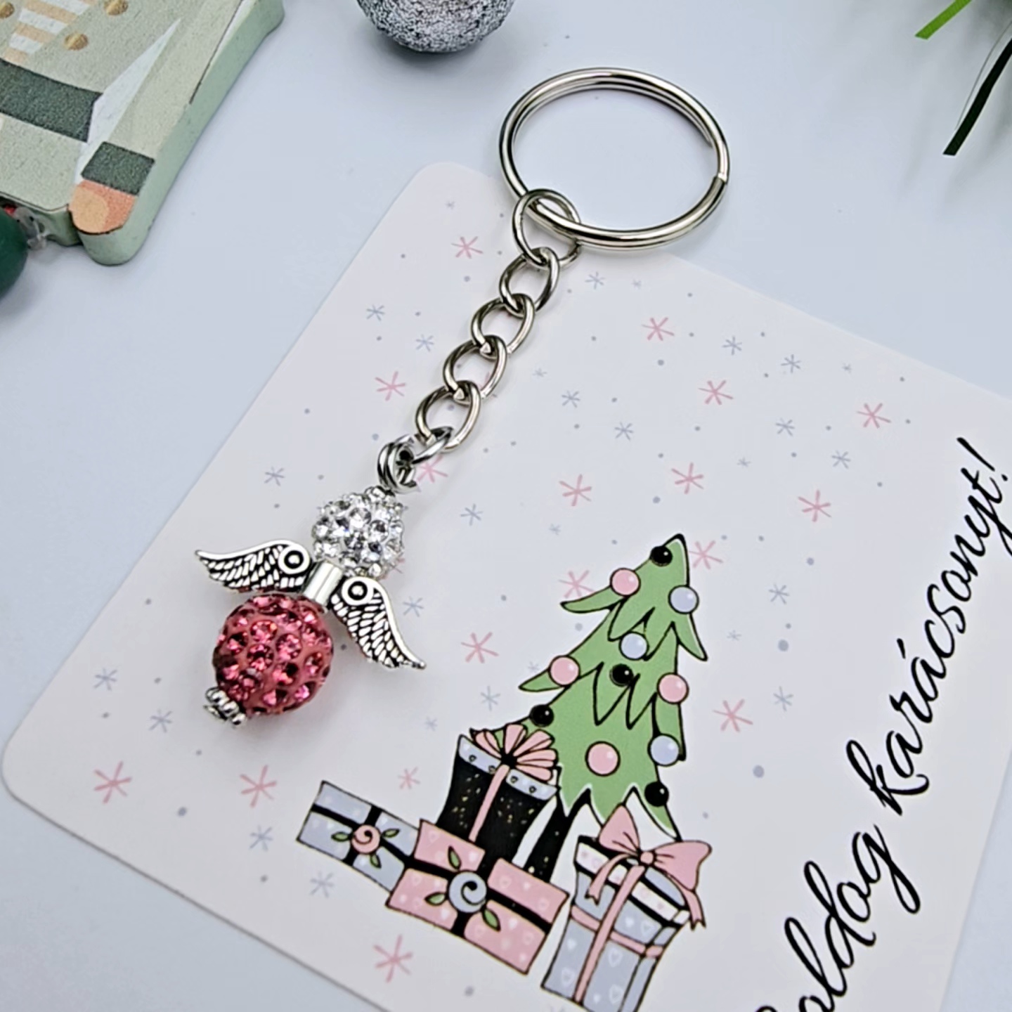 Ez a különleges karácsonyi angyalka kulcstartó tökéletes választás szeretteink számára, akik értékelik az egyedi és kézzel készített ajándékokat. Az angyalka mérete kb. 2,8 cm. A kulcstartót egy karácsonyi ajándékkártyával szállítjuk, melyen a "Boldog karácsonyt!" üzenet olvasható. (Egyedi, személyre szabható felirat ennél a terméknél nem kérhető.)