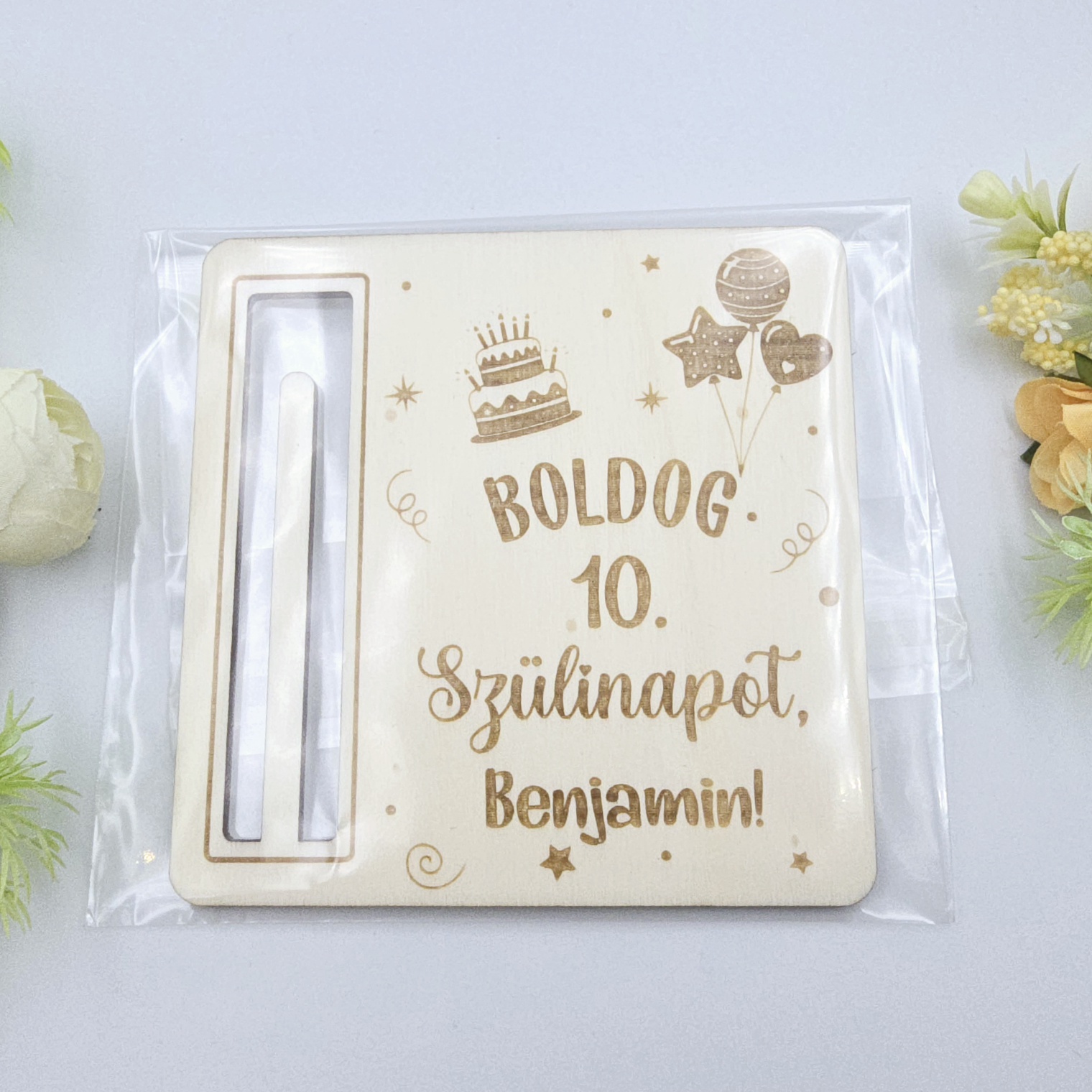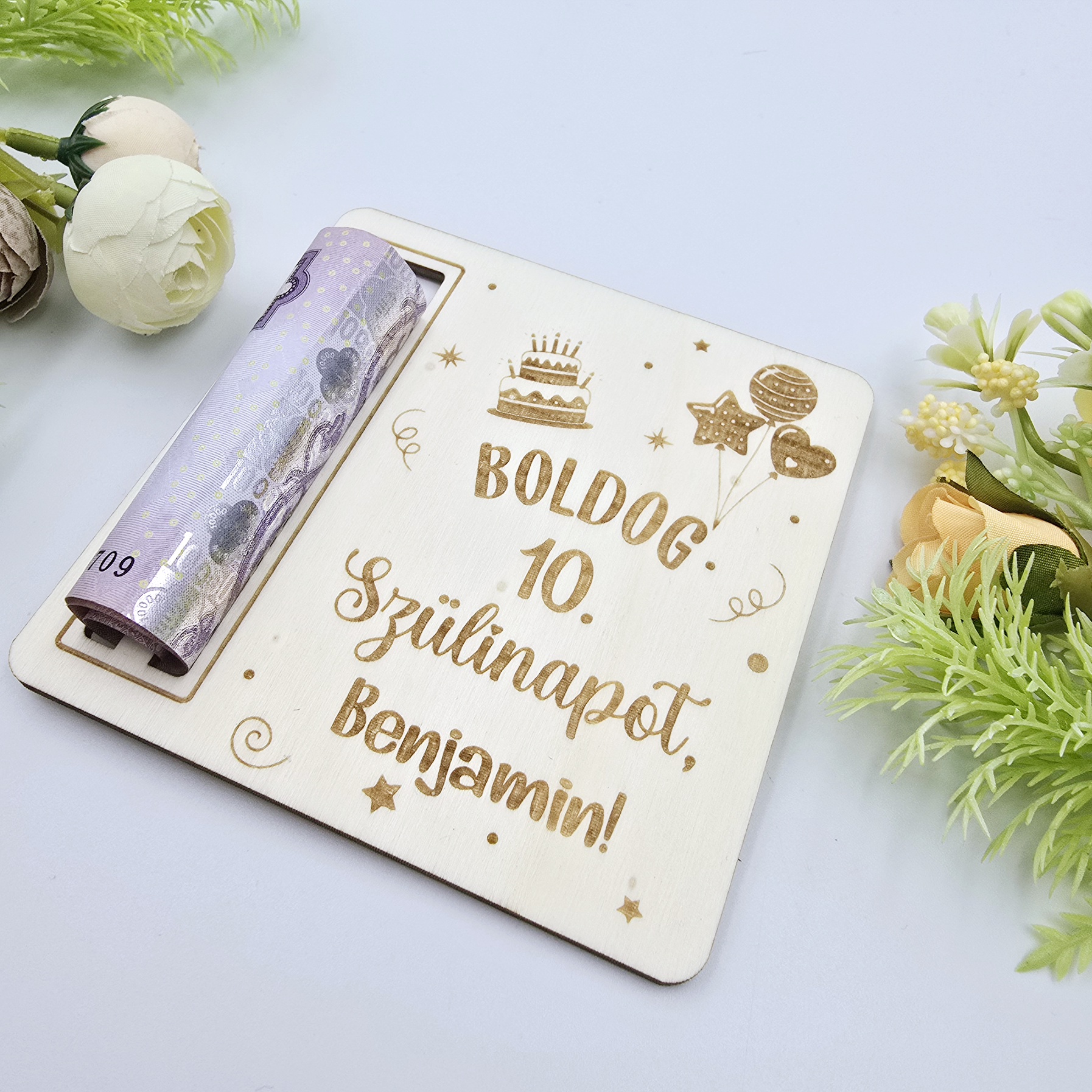 Egyedi névvel készülő szülinapi pénzátadó, amely praktikus megoldás, ha pénzt adnál ajándékba az ünnepeltnek. A termékre egy szabadon választott név, és szám kerül.