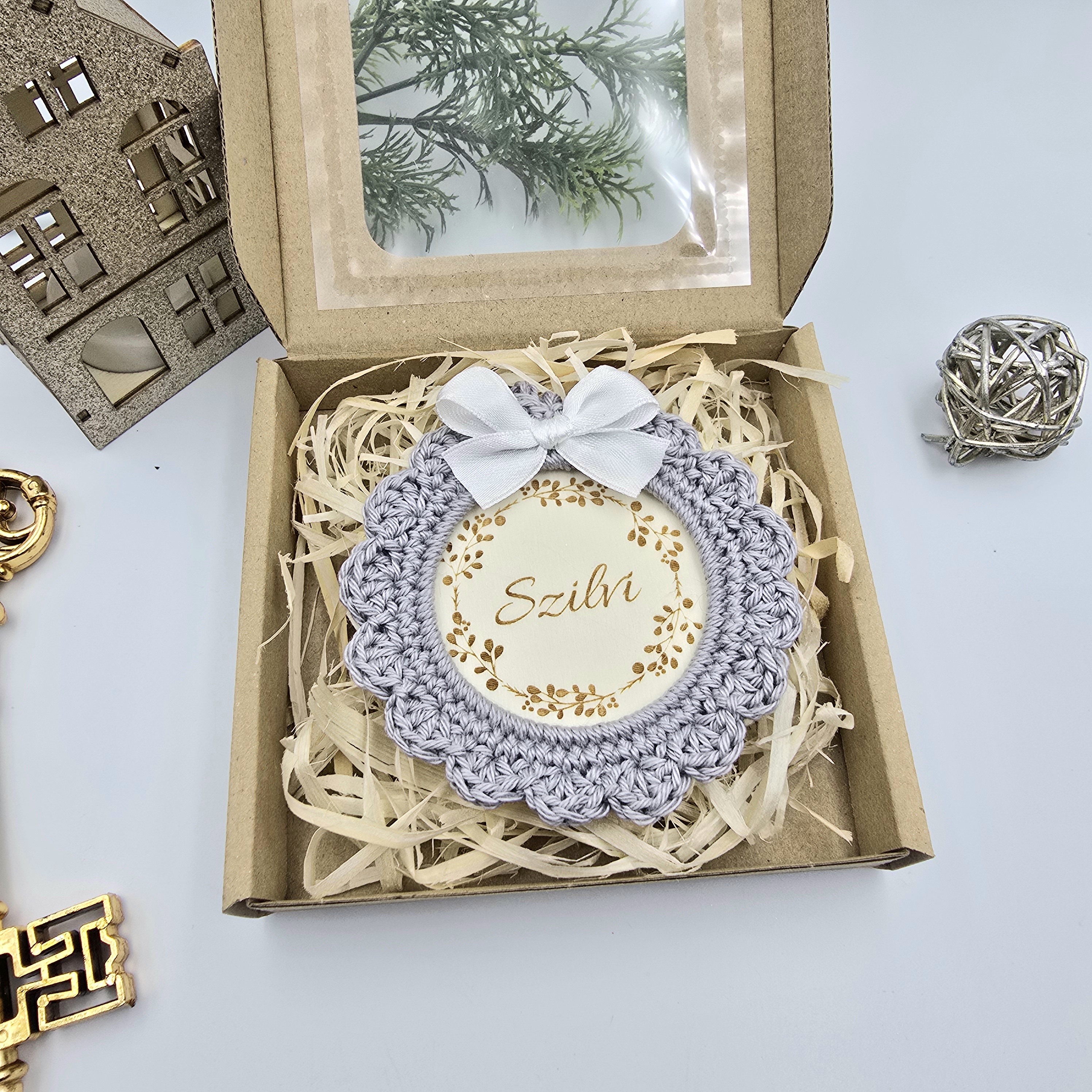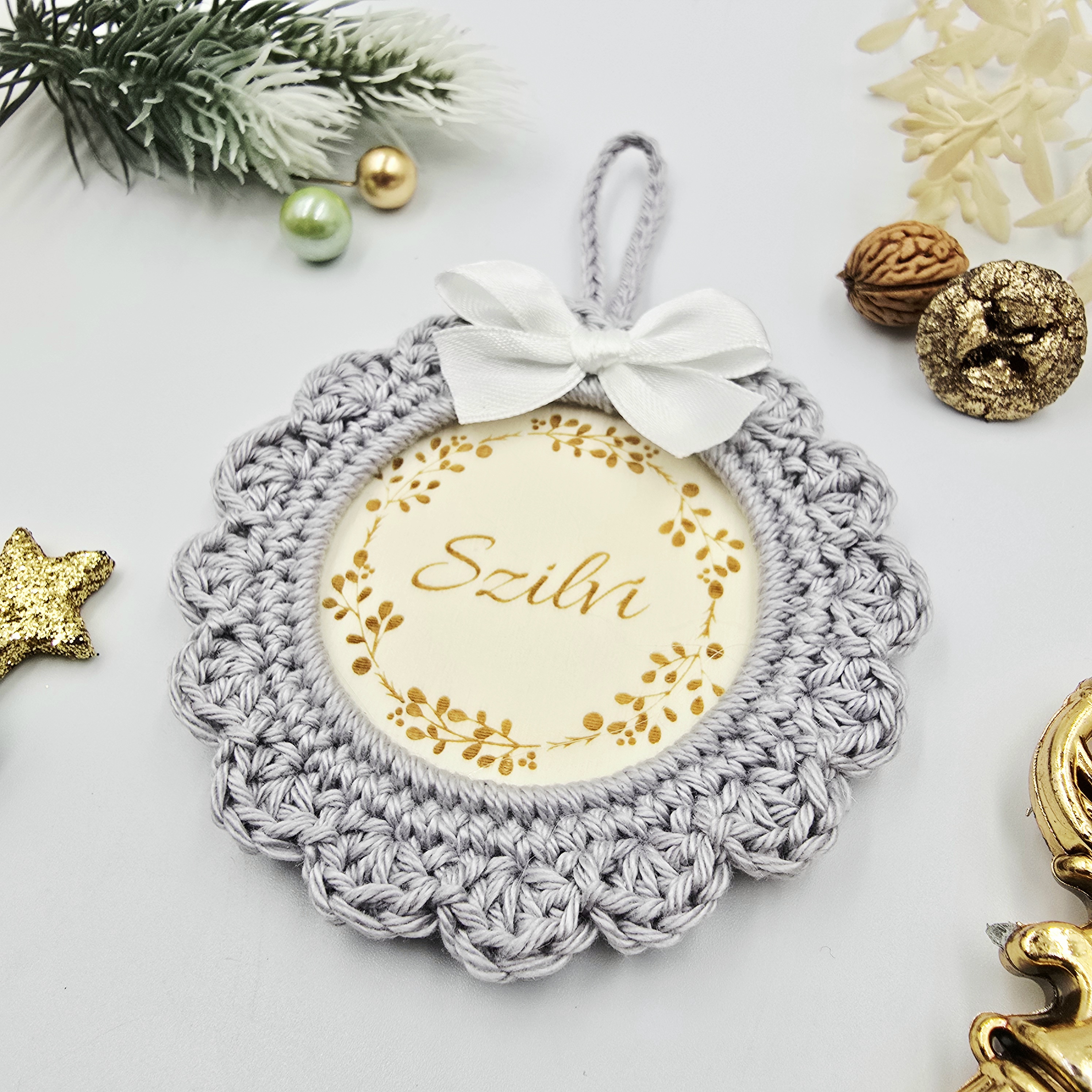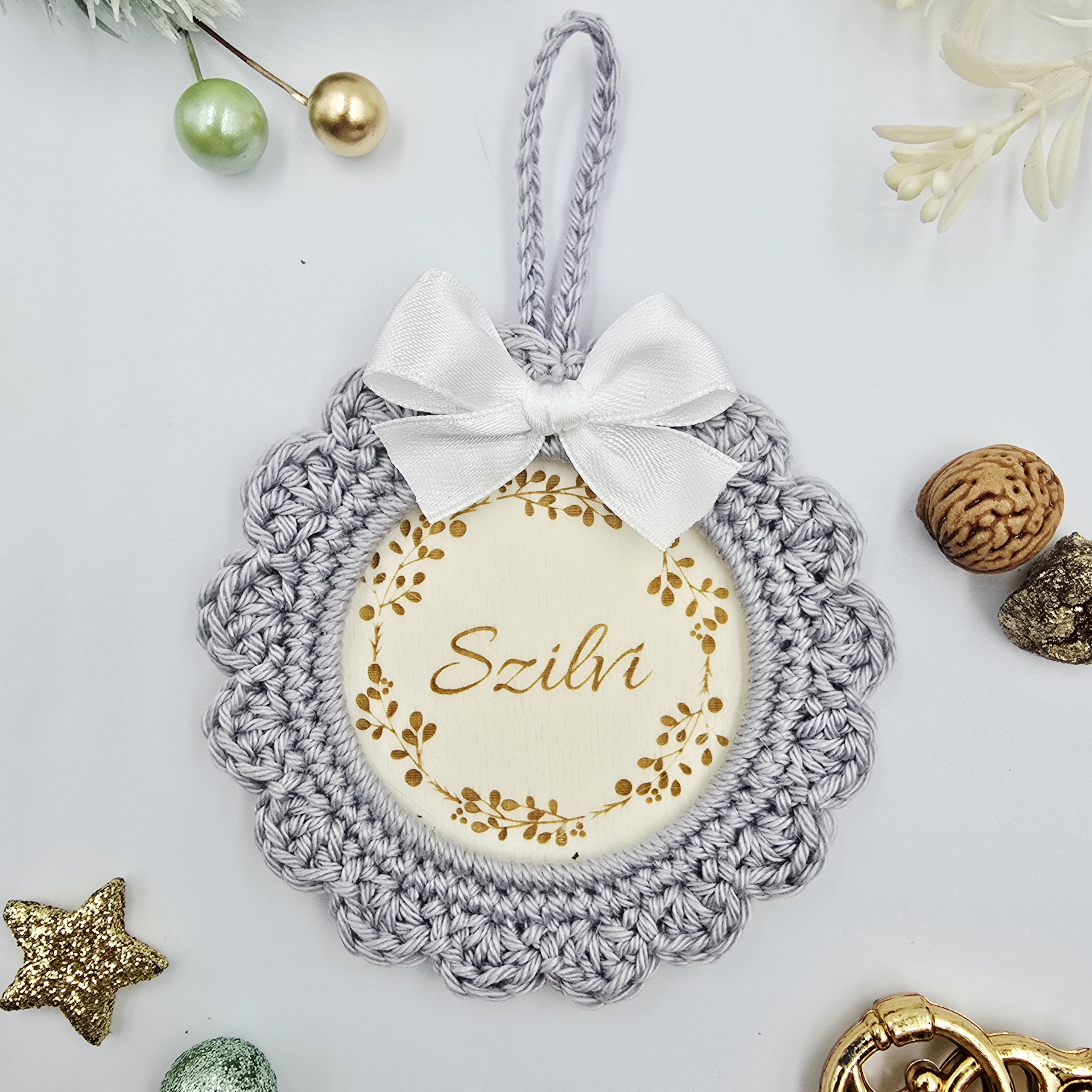 A forma klasszikus kör, mely könnyű, mégis tartós. Az egyedi horgolt keret és a gravírozott név együttesen teszik igazán különlegessé ezt a kis karácsonyi alkotást.
