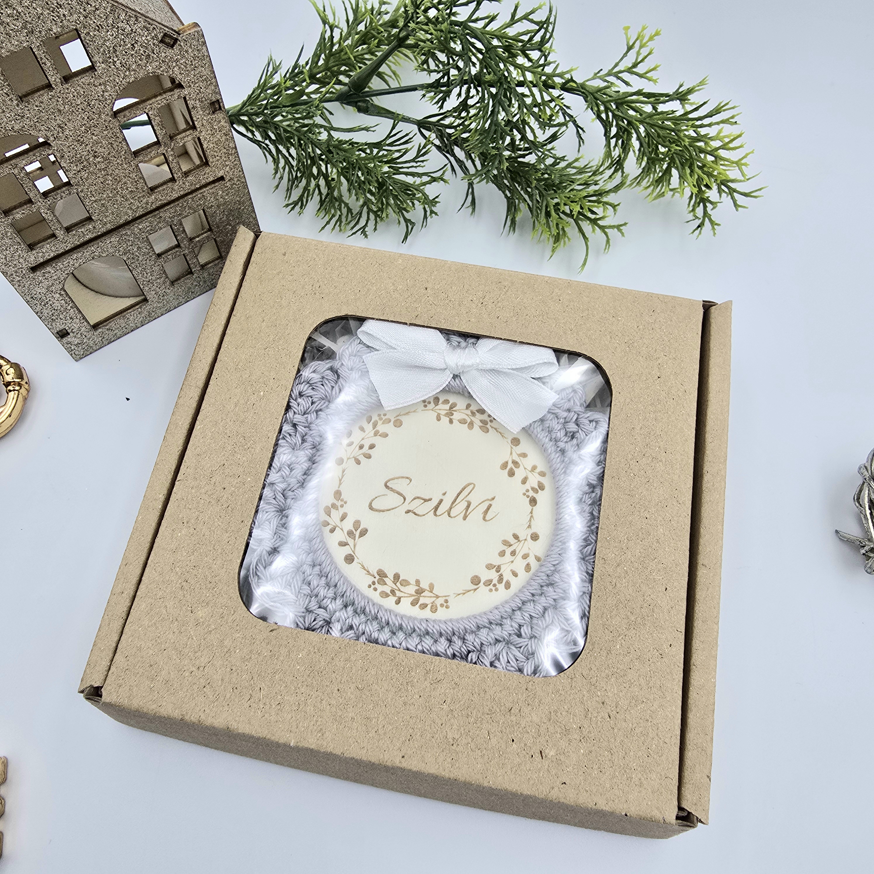 Ajándékozáshoz kérhető hozzá fehér organza ajándékzsák vagy ablakos ajándékdoboz is. Az ajándékdoboz kartonból készül, átlátszó előlapjával szépen láttatja a díszt, és természetes megjelenésével tökéletesen illik a termékhez. Mindkét csomagolás külön rendelhető, feláras opcióként.