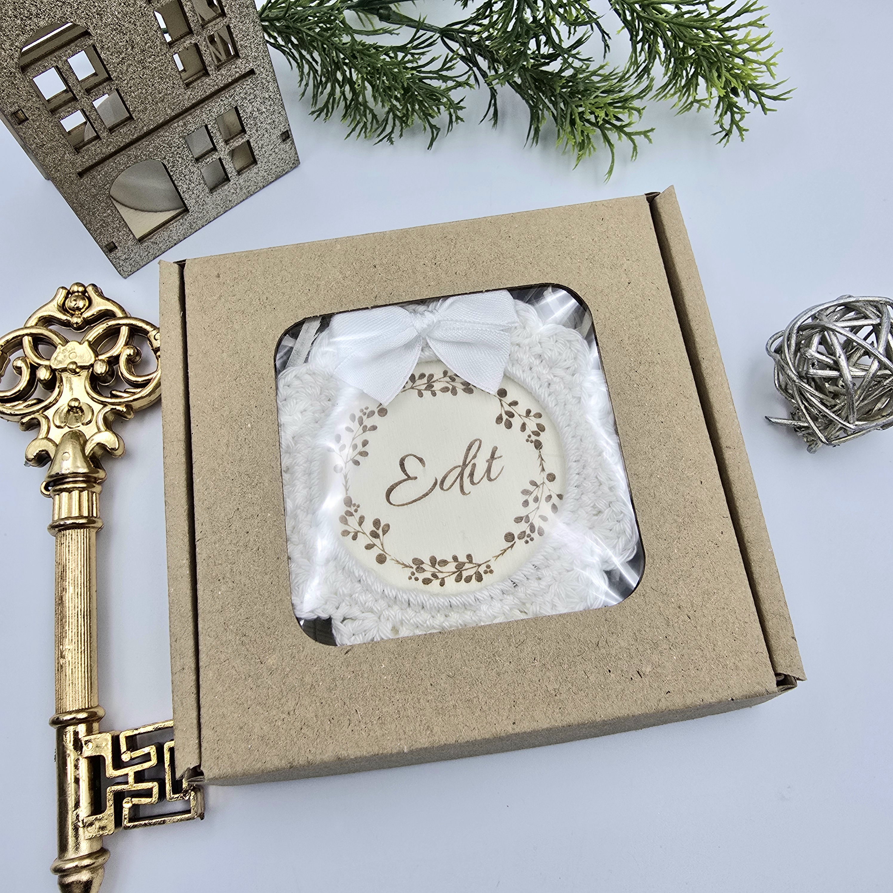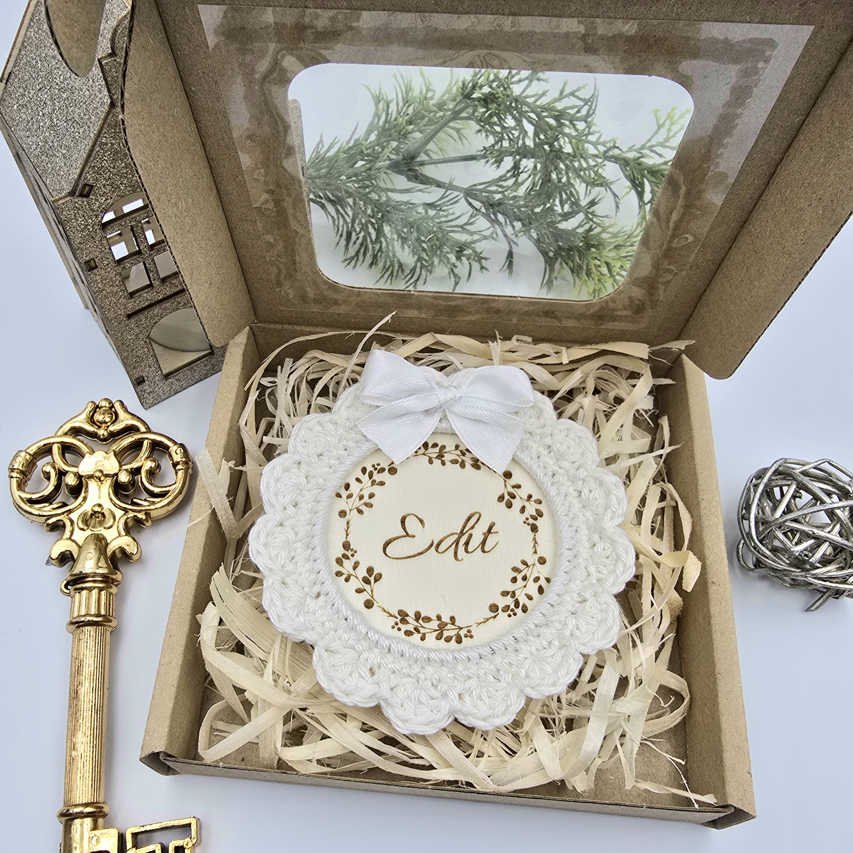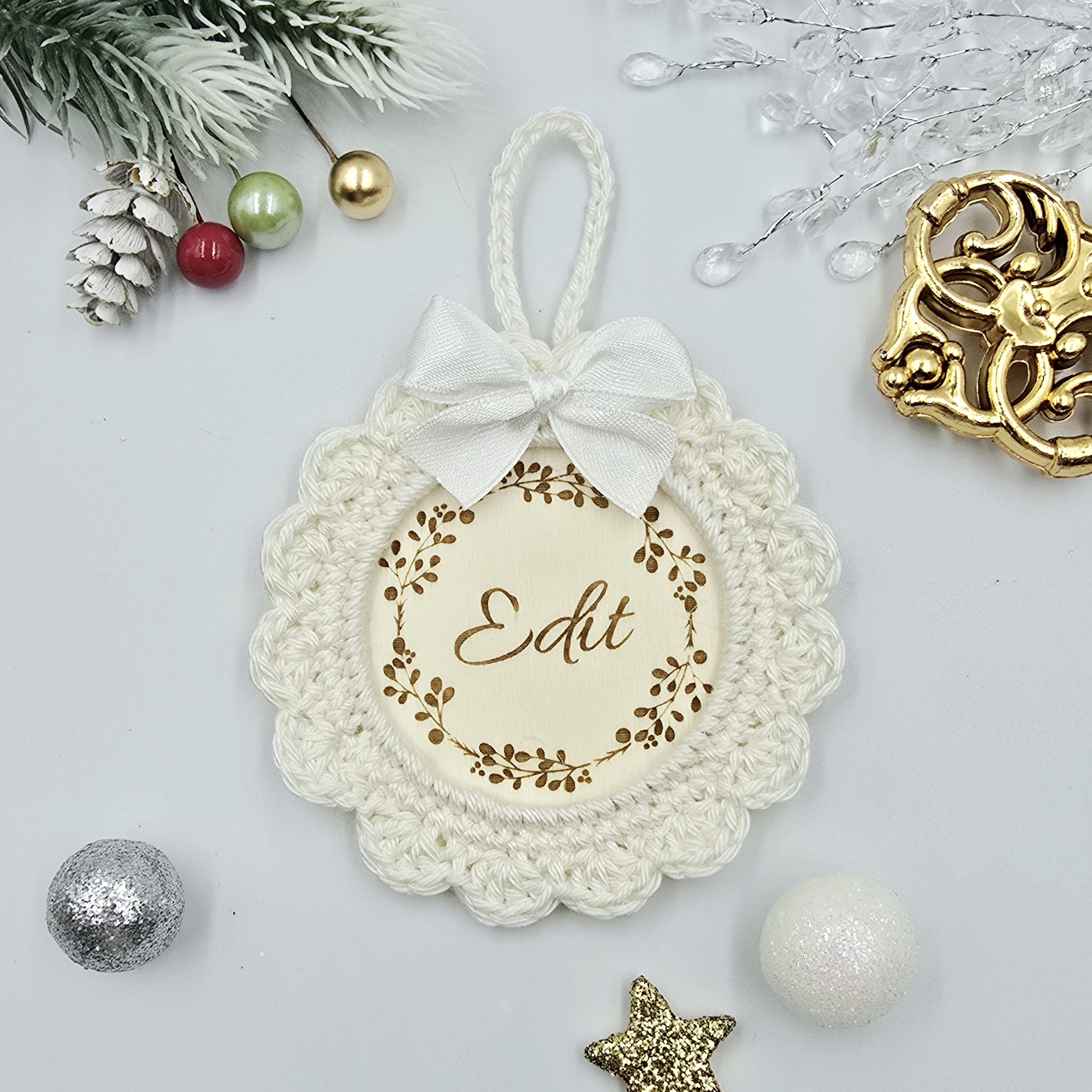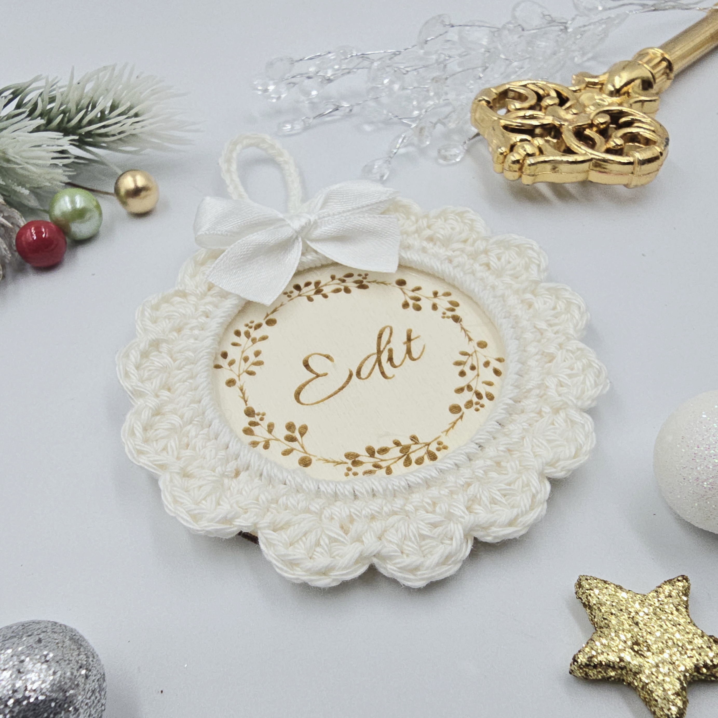 A forma klasszikus kör, mely könnyű, mégis tartós. Az egyedi horgolt keret és a gravírozott név együttesen teszik igazán különlegessé ezt a kis karácsonyi alkotást.
