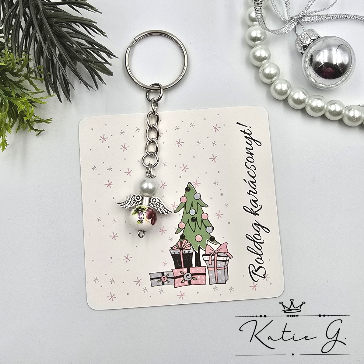 Ez a különleges karácsonyi angyalka kulcstartó tökéletes választás szeretteink számára, akik értékelik az egyedi és kézzel készített ajándékokat. Az angyalka mérete kb. 2,8 cm. A kulcstartót egy karácsonyi ajándékkártyával szállítjuk, melyen a "Boldog karácsonyt!" üzenet olvasható. (Egyedi, személyre szabható felirat ennél a terméknél nem kérhető.)